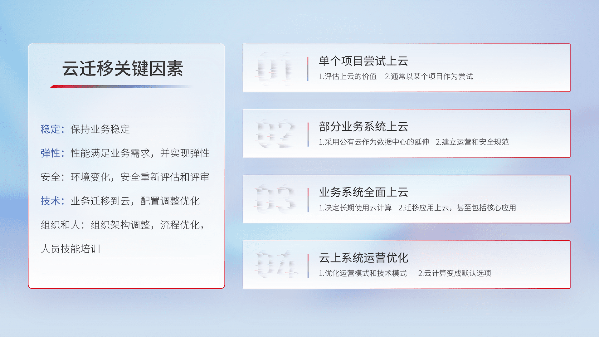 结合实际业务,,,从规划设计、、、、云平台选型、、、云原生改造、、、、数据迁移、、集成交付,,,,迁移全过程为客户识别最佳上云路径,,,,做好风险识别管理,,,设计网络架构、、、身份权限、、、安全审计合规、、、操作审计、、、日志审计、、监控告警策略、、、、多站点容灾设计等,,,对云上基础设施进行整体规划,,,,提升IT治理水平,,以满足弹性、、、、高可用、、、高性能的需求。。。